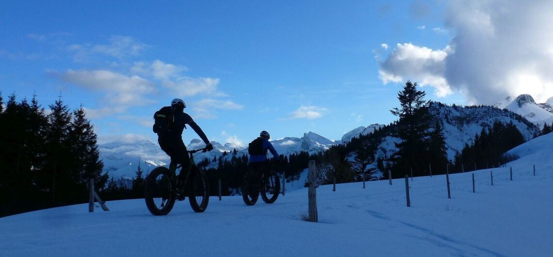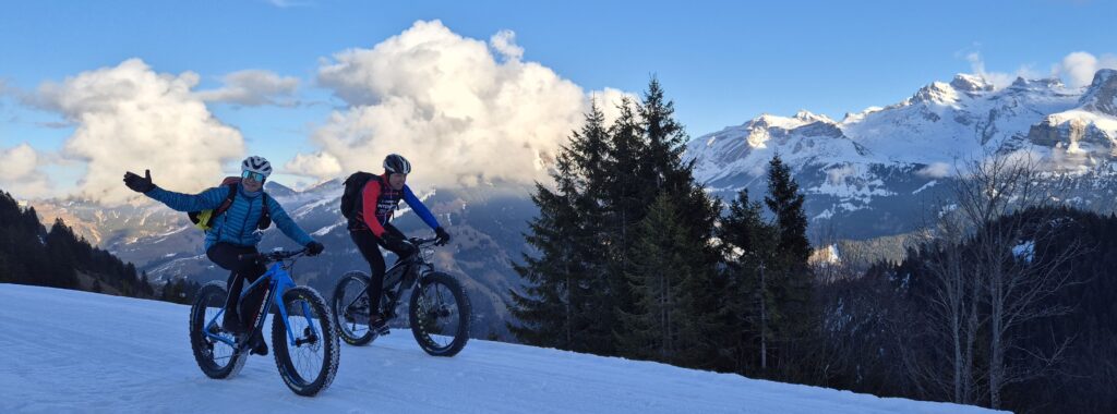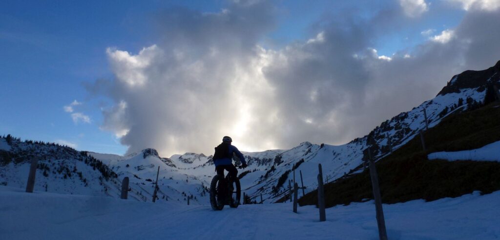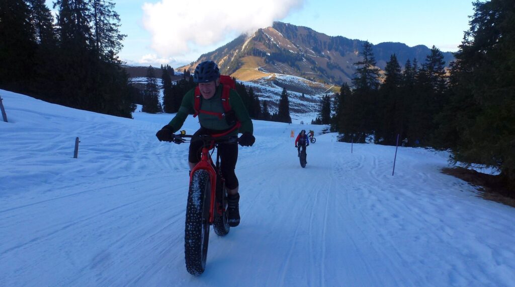 Beim Start in Dallenwil ist es frühlingshaft warm – Felix fährt sogar mit Kurzarm-Tricot los… Ab 1200 Metern erwartet uns dann eine geschlossene Schneedecke und auch die Temperaturen werden nun zunehmend winterlich. Der Schnee ist griffig und es geht steil bergan. Mit 0,2 Bar in den Reifen haben wir besten Gripp auf diesem Schlittelweg.