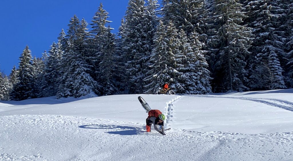 Bei weit über einem Meter Schnee waren Tiefschneeabfahrten eine besonders grosse Herausforderung. Die Hänge mussten steil sein und zugleich sollte man gefasst sein, dass jederzeit das Vorderrad abtaucht und ein entsprechender Abgang ansteht. Wir hatten unseren Spass – Dank dem Übermut jedes einzelnen gab es in diesen Tagen einiges zu lachen.