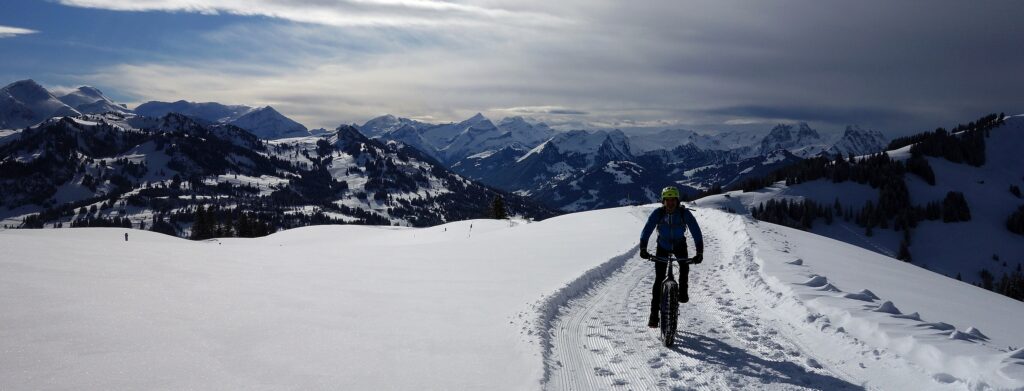 Darf es noch ein bisschen mehr sein…? Wir sind gerade ziemlich überwältigt von der ganzen Fatbike-Ambiance und so bauen wir kurzerhand eine Zusatzschleife ein. Der Schnee hat sich inzwischen etwas mehr gesetzt und wir rollen jetzt deutlich rasanter über „unsere“ Wintertrails. Im Hintergrund sind Wildhorn und Diablerets zu erkennen. Diese Fels- und Gletschergipfel markieren die Grenze zum nahen Wallis. In der Jungsteinzeit – vor über 6500 Jahren – haben bereits Jäger und Sammler in dieser Region die Alpen überquert. Es sind einige der geschichtsträchtigsten Übergänge der heutigen Schweiz. Trotzdem haben sie, ausgenommen bei Wanderern und einigen wenigen Bikern, ihre Bedeutung bereits vor hunderten von Jahren komplett verloren.