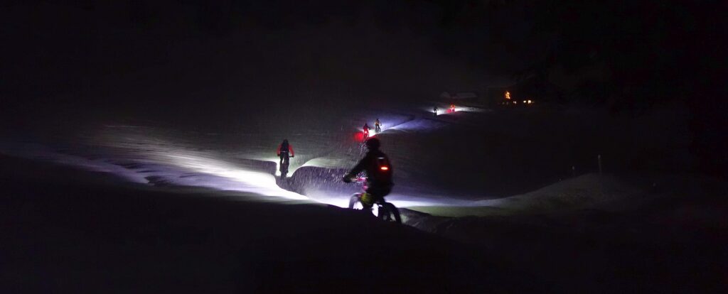 Am Abend wartet noch der obligate Night-Run auf uns. Und dies im schönsten Schneefall. Einmal mehr ein perfektes Timing, denn jetzt ziehen wir mit den dicken Reifen unsere Spuren in den Neuschnee. Es soll ein spezieller Ort sein denn wir am Abend noch erleben. Wir fahren hoch zum Lauenensee. Ein See der vor allem durch die Musikgruppe Span Bekanntheit erlangte. 1983 wurde der Song veröffentlicht und bis heute ist er ein Ohrwurm geblieben: «Immer wenn i wieder dra dänke / a das Gfüeuh dert am Ufer vom See / de merk i wie guet dass’s mer ta het / i gloube I gange no meh a Louenesee.»