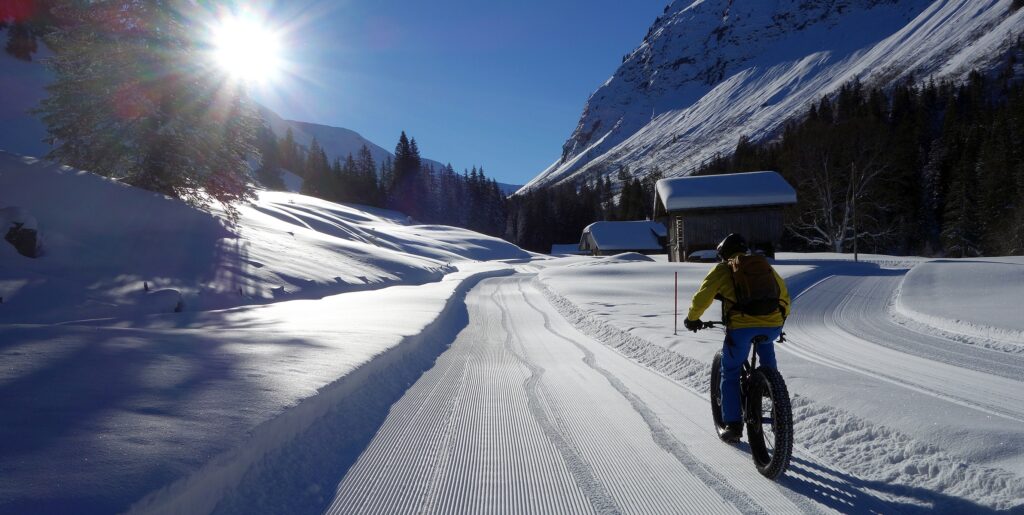 Positiv überrascht waren wir vom puren Sonnenschein an unserem zweiten Tourentag. Denn am Vorabend prognostizierten die Meteorologen doch eher etwas bewölktes Wetter. Da bereits die Nacht sternenklar war sackte das Thermometer auf -11°C ab. Aber diese Winter-Bilder und die frisch hergerichteten Winterwege wärmen wohl jedes Fatbiker-Herz. Schöner geht es nicht mehr im einsamen Turbachtal. Erst fünf Monate ist es her als uns auch die 2 x 5000 Hm Tour durch dieses wunderschöne Tal führte.