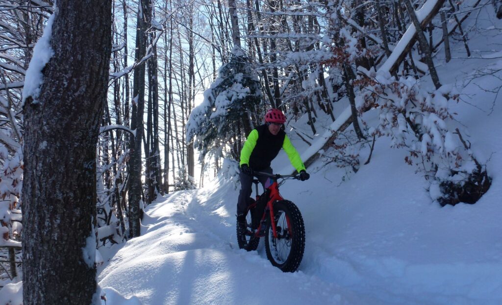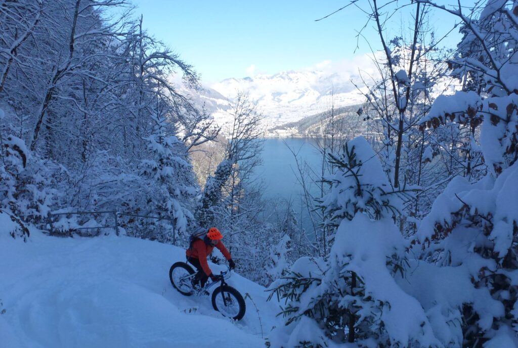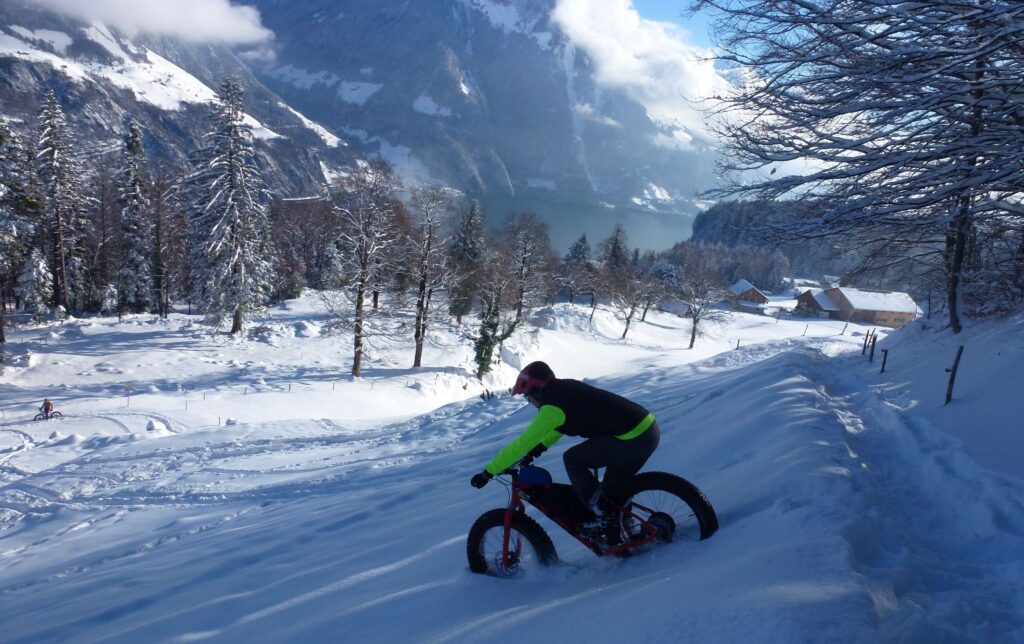 Die Abfahrten ein Traum. Unverspurter Tiefschnee, breite Reifen, viel Flow und dieses breite Grinsen im Gesicht, das man auch bei minus vier Grad nicht mehr wegkriegt. Fatbiken, wie es im Bilderbuch steht.