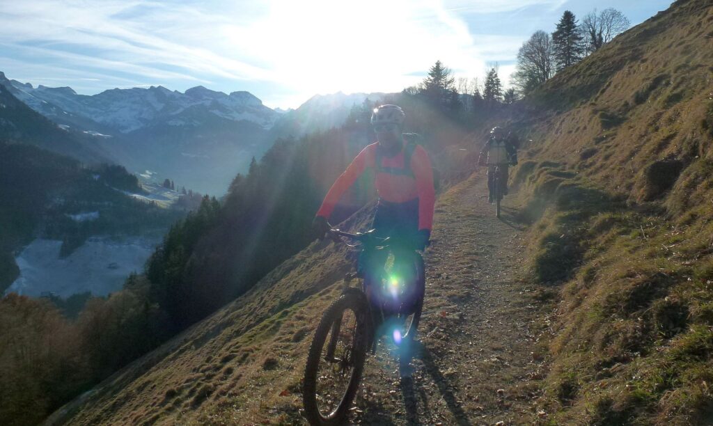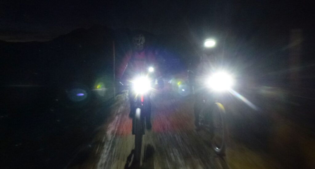 Nun das Schlussbouquet. Der Vollmond steht bereits am Himmel, wir schalten die Lichter ein und stechen in die Abfahrt. Rasant, verspielt, punktuell technisch. Die Trails ziehen sich lange ins Tal. Im Schein unserer Lampen rauschen wir durch Wälder und über offene Hänge hinunter. Ein Moment, der bleibt. Ein Neujahrs-Ride ohne Schnee – und trotzdem wunderschön. Danke euch allen für diesen besonderen Tag, für die gemeinsamen Erlebnisse, die Emotionen und den perfekten Start ins neue Bikejahr.