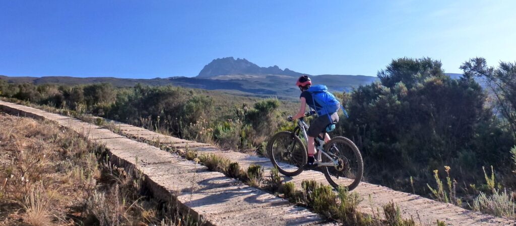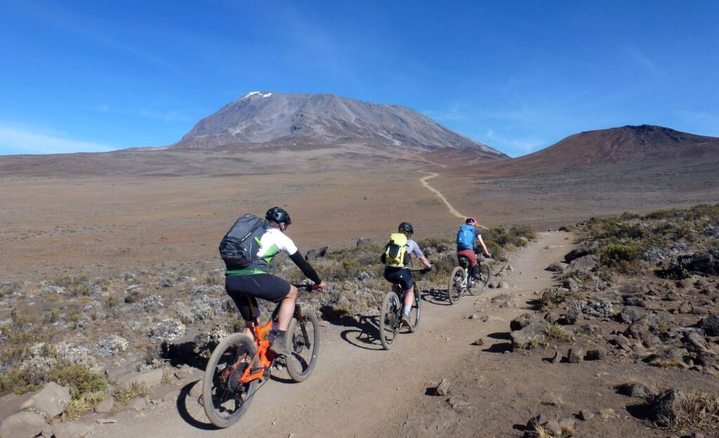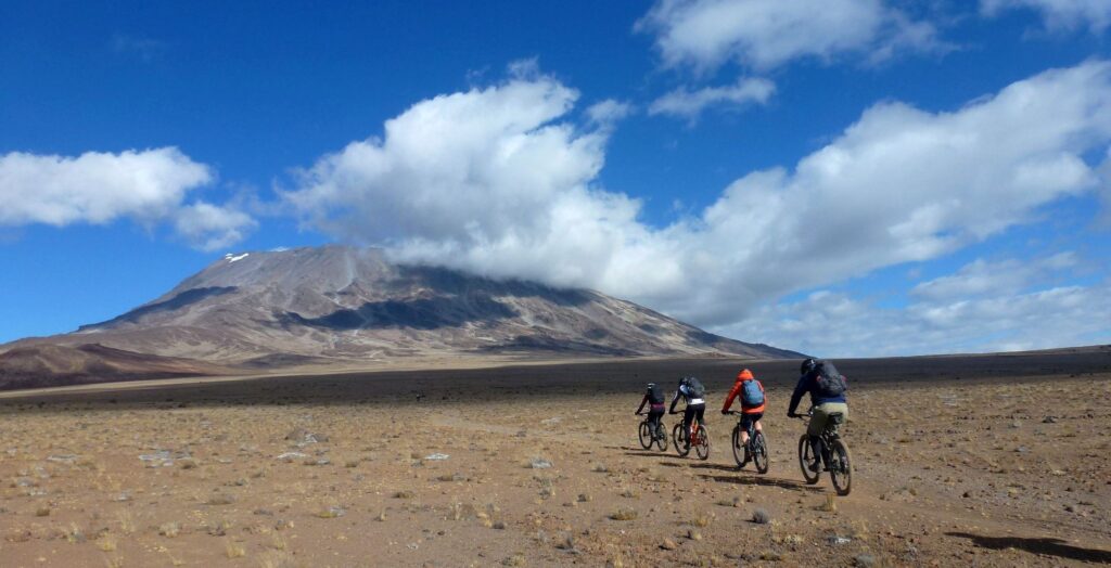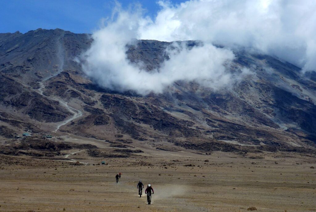 Ein Singletrail führt heute bergan bis zu unserem dritten Camp auf 4550 Meter. Dazwischen gibt es eine kurze Abfahrt- hier erleben wir die faszinierende «Höhenwüste» besonders intensiv. Sie zieht uns tief in ihren Bann. Der Kilimanjaro präsentiert sich nun wie auf dem Serviertablett und das Ganze nahezu menschenleer. Es scheint als hätten wir den Berg für uns alleine.