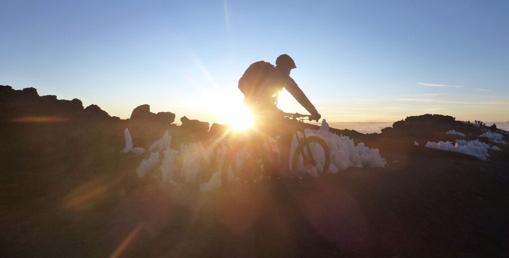 Heute ist der Tag der Gipfelbesteigung. Fast 1200 Höhenmeter sind es bis zum Uhuru Peak (5895 m). Wegen dem Wetterumschwung starten wir bereits um Mitternacht. Nach 500 Höhenmetern sind wir bei unseren Bikes. Unsere Träger unterstützen uns ab nun. Fahren ist hier nicht möglich und die Schritte sind bewusst klein. Beim Gilmans Point (5685 m) erreichen wir den Kraterrand – mit einem Durchmesser von 2,4 auf 1,9 km ist auch er riesig. Es geht nun deutlich flacher zum Stella Point (5744 m) und noch im dunkeln weiter bis zum Uhuru Peak.