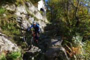 Du willst in Zukunft sicher auf S4-Trails unterwegs sein. Dies sind steile und verblockte Singletrails mit großen Felsbrocken und/ oder anspruchsvollen Wurzelpassagen, dazwischen häufig loses Geröll. Extreme Steilrampen, enge Spitzkehren und Stufen, bei denen das Kettenblatt unweigerlich aufsetzt, kommen im 4. Grad häufig vor weshalb sicheres Springen und Dropen wichtig werden.