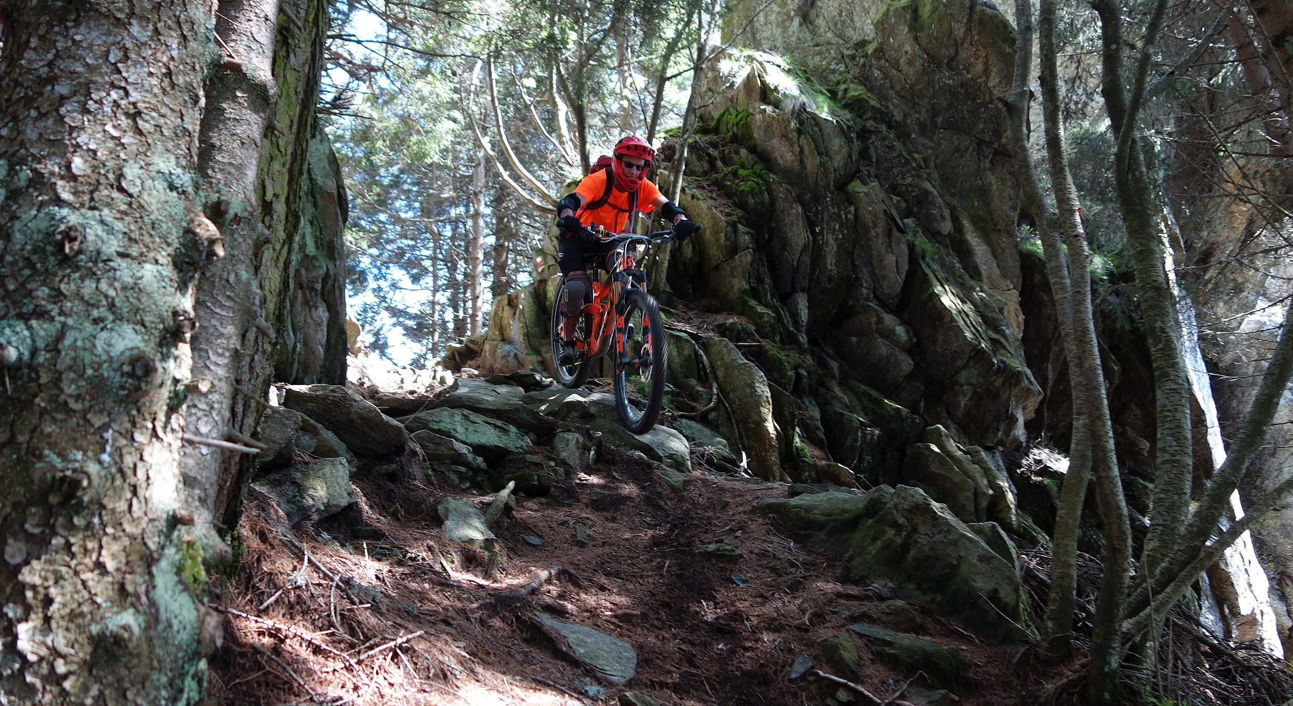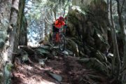Du bist bereits auf S3-Trails unterwegs. Verblockte Singletrails mit vielen grösseren Felsbrocken und/ oder Wurzelpassagen gehören zu dieser Kategorie. Hohe Stufen, Spitzkehren und kniffelige Schrägfahrten kommen oft vor, entspannte Rollabschnitte werden selten. Häufig ist auch mit rutschigem Untergrund und losem Geröll zu rechnen, Steilheiten über 70% sind keine Seltenheit.