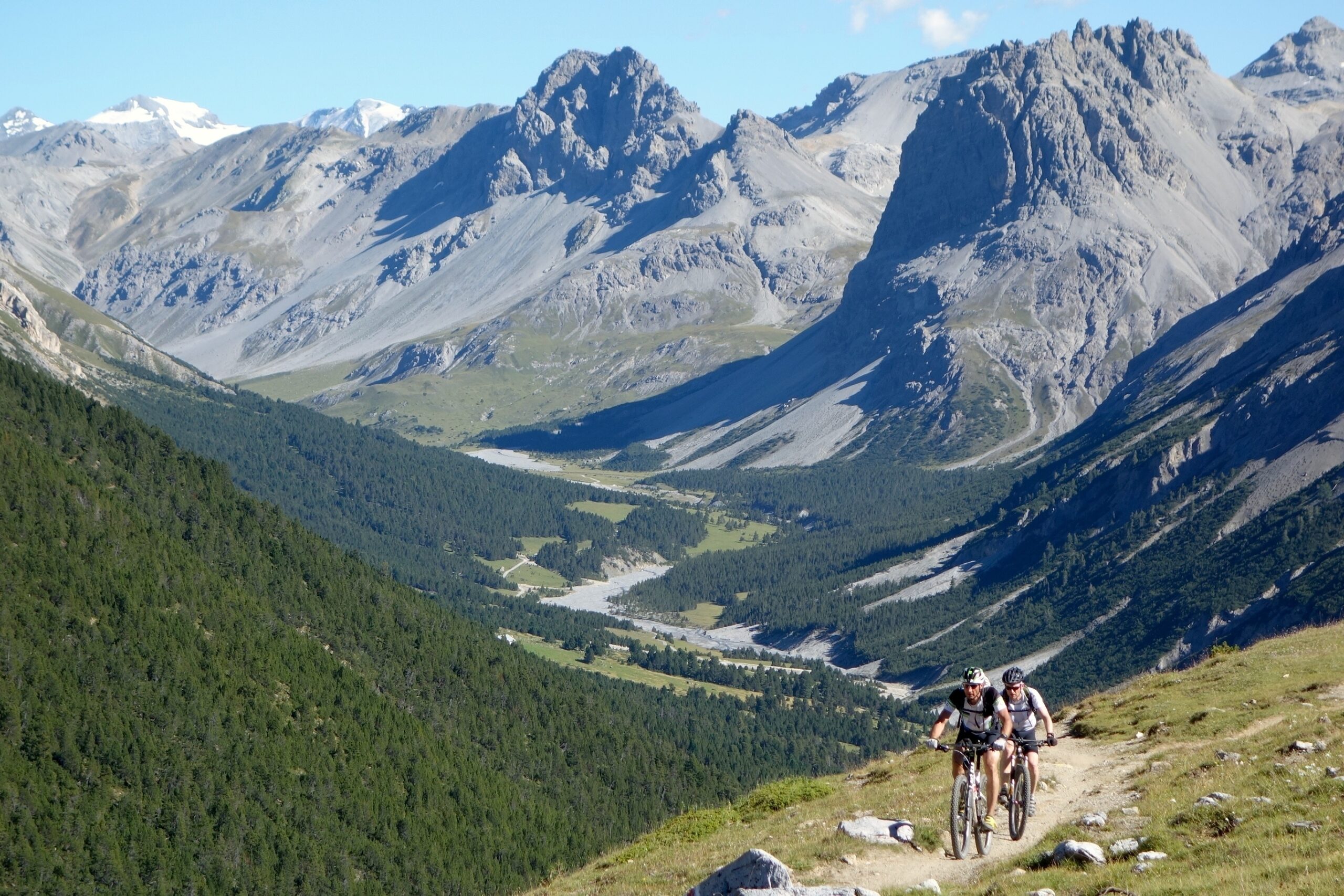 Alte Militärwegen und geheime Schmugglerpfade lassen uns die Geschichte des Alta Rezia spüren. Die Region, wo sich Val Müstair, Engadin und Vinschgau berühren, war einst Grenzland voller Abenteuer und Begegnungen. Noch heute erzählen die Pfade von Zeiten, in denen Waren im Schatten der Berge die Grenze wechselten. Unsere Reifen rollen dort, wo einst Soldaten, Schmuggler, Säumer und Hirten ihre Spuren hinterlassen haben. Der Herbst verleiht diesen Tälern ein besonderes Leuchten, wenn goldene Lärchen und klare Höhenluft den Rhythmus bestimmen. Es ist wie Magie, wenn sich die Gipfel in den tiefblauen Bergseen spiegeln und uns endlos lange Trails durch eine der schönsten Alpenlandschaften tragen. Dabei erleben wir Biken in seiner reinsten Form. Hochtäler öffnen sich, auf denen Natur und Geschichte miteinander verschmelzen. Jeder Trail erzählt ein Kapitel – von Schmuggel, Freiheit und alpiner Wildheit. Die Felslandschaften erinnern uns daran, wie ungezähmt die Alpen sein können.