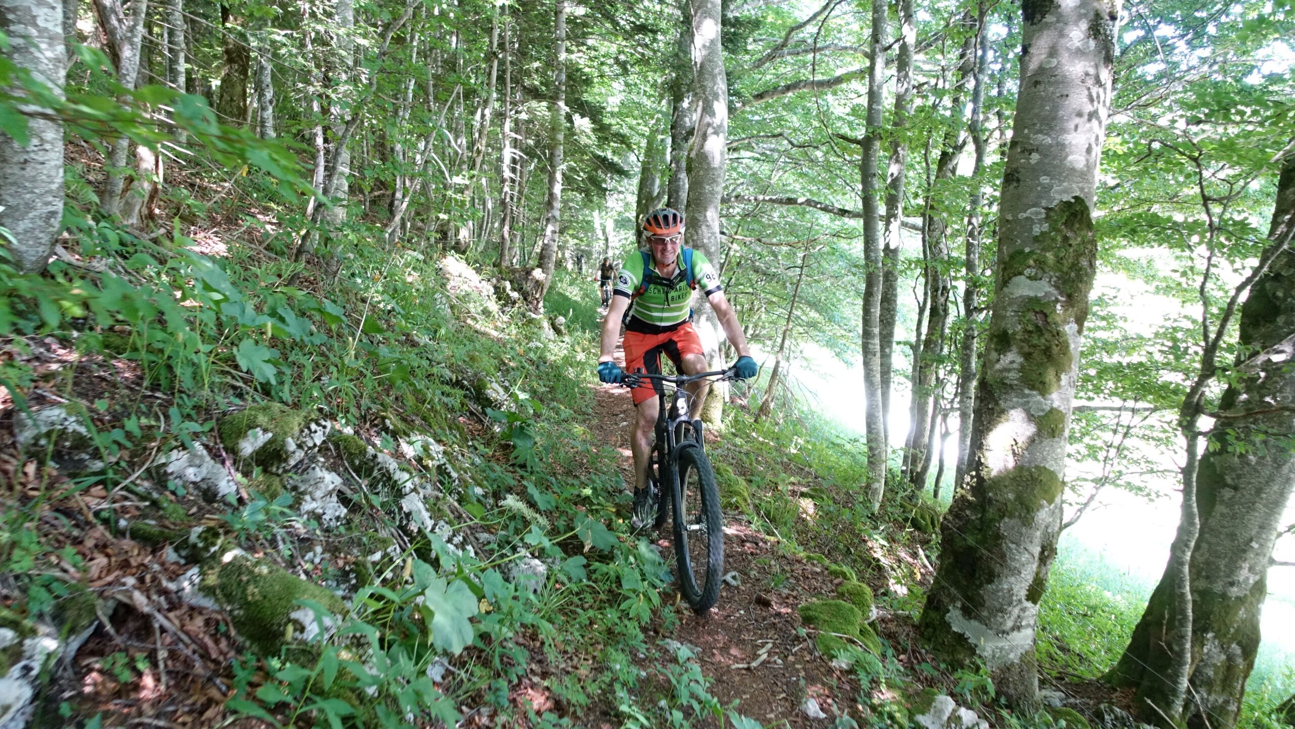 Die Gruppe B fährt über grosse Distanzen dieselben Trails wie die Gruppe A, nur die anspruchsvollsten Teilstücke werden auf etwas einfacheren Trails umfahren. So entfallen die wenigen S3 Passagen. Weiter wird beim zweiten Tourentag eine Bahn eingebaut weshalb hier elegant 600 Hm eingespart werden. Die Feingliedrige Landschaft und die grosse Anzahl von Wegen ermöglichen eine Tour, die sich zwischen zwei Etappenorten sehr stark komprimieren und ausbauen lässt. So kann man nicht nur jeden Tag wählen, ob man in Gruppe A oder B mitfahren will, teils ist es sogar möglich, innerhalb einer Tour zu wechseln. Auch in der Gruppe B fahren wir soviel wie möglich Singletrail, d.h. auch bergauf, wobei der technische Anspruch nur selten über S1 hinausgeht. Für die genussvolle Teilnahme ist eine gute Kondition und gute Fahrtechnik erforderlich (Level 3; siehe Homepage).