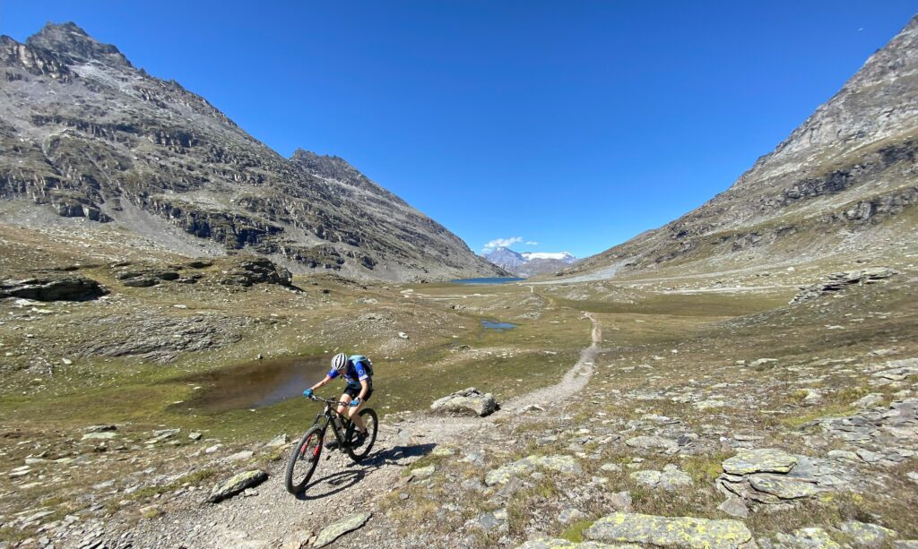 Nach dem Übergang öffnet sich ein Tal, in welchem sich ein Bilderbuch-Trail hinunterschlängelt. Abwechslungsreich und verspielt inmitten einsamster Gebirgslandschaften. Ein nahezu unendliches Trailfinale fernab jeglicher Zivilisation. Ich vermute, dass es einer von diesen sagenumwobenen und gut versteckten Waldenser-Wegen ist.