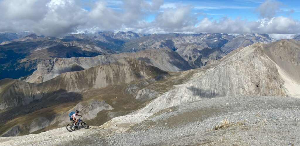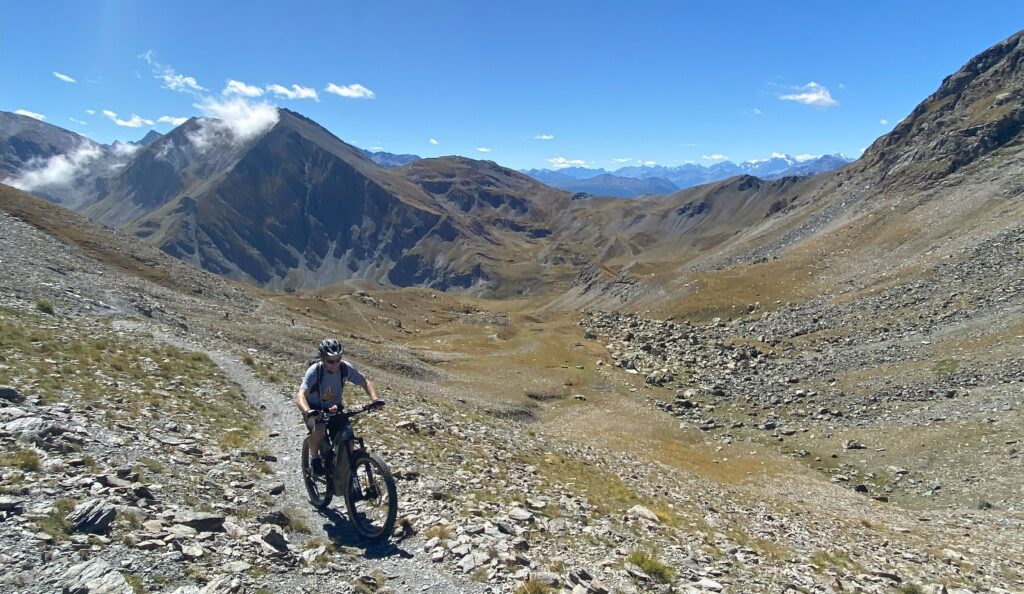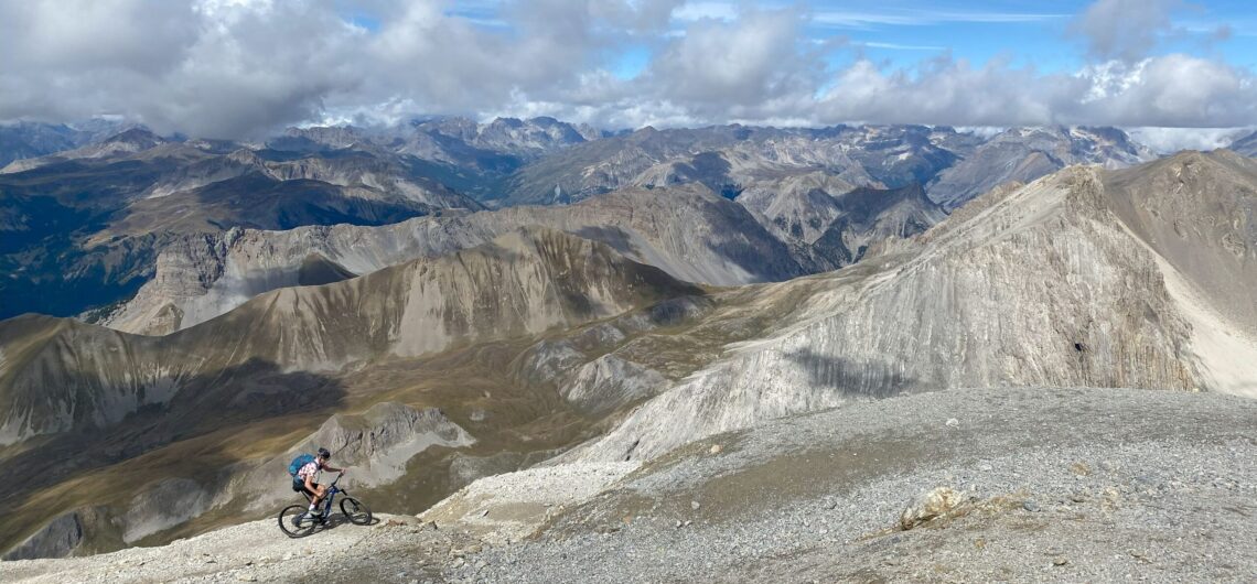 Heute steht die höchste historische Militärfestung der Alpen auf dem Programm. Der Gipfel auf über 3100 Metern ist die grösste Challenge, der man sich als Biker in den Westalpen stellen kann. Der Zahn der Zeit nagt am alten Wegetrassee. Ein Murgang droht an einer Stelle akut das Trassee in die Tiefe zu reissen. Gut möglich, dass diese einzigartige Befahrung – dieser Biker-Mythos – auch bald „Geschichte“ ist… Mit Bärenkraft und kleinsten Übersetzungen ist nach wie vor ein Grossteil fahrbar – ein ultimativer Kraft- und Konditionstest, der durch die dünne Luft zusätzlich verschärft wird. Es ist eine Challenge mit sich und den Gegebenheiten. Mit jedem Höhenmeter wird das Panorama spektakulärer. Ganz zum Schluss würde bei klarsten Bedingungen die Sicht bis zum Mont-Blanc reichen. Heute begnügen wir uns mit dem Pellvoux Massiv (südlichster 4000-er) im Westen, dem Rocciamelone (höchster Wallfahrtsberg mit 3520m) im Norden und mit einer atemberaubenden Perspektive in die tief unter uns gelegenen Täler. Es ist das achte Mal, dass ich mit meinem Bike diesen Berg erklommen habe – jedes Mal war es eine ultimative Herausforderung, welche auf dem Gipfel mit einem wunderbaren Glücksgefühl gekrönt wurde.
