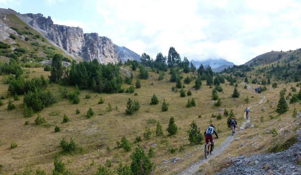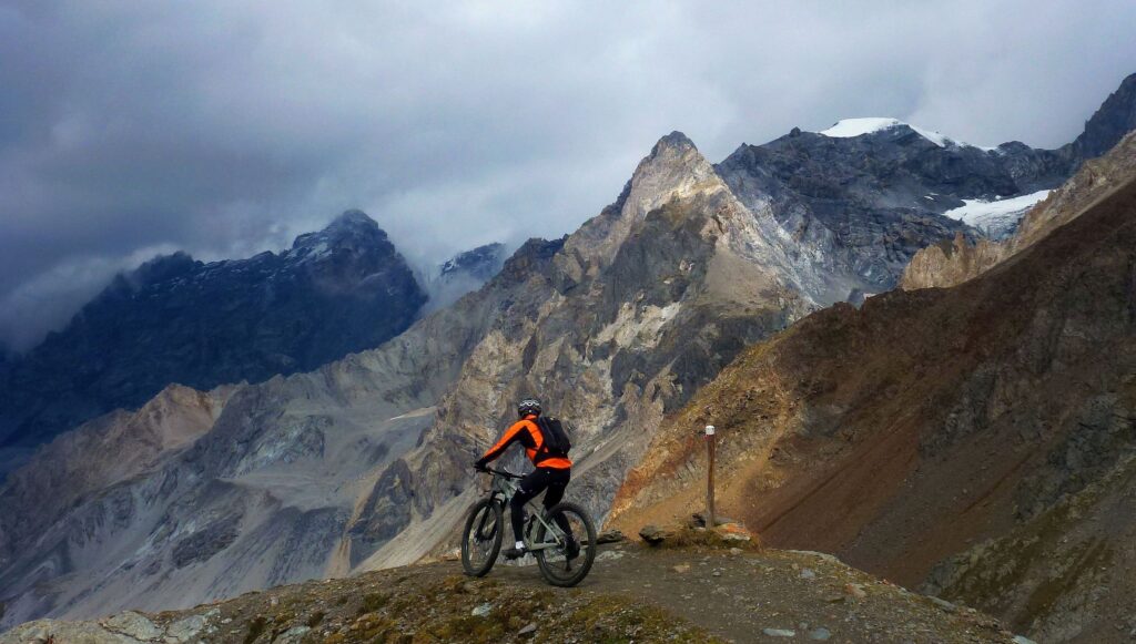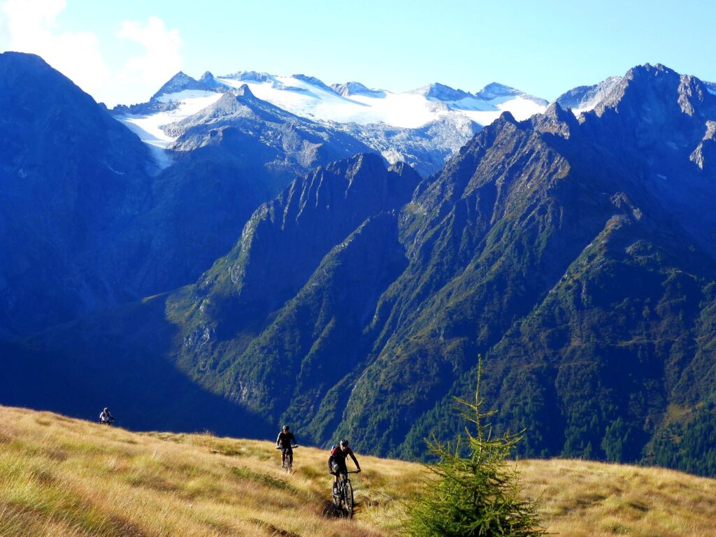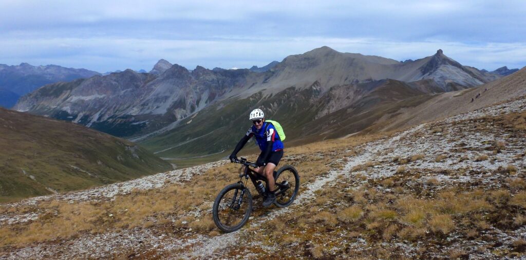 Schon der Start der Tour ist Singletrail-Genuss vom Feinsten. Verspielt zieht er durch duftende Lärchenwälder und bereits wenige Minuten nach dem Start haben wir unsere «Betriebstemperatur» erreicht. Die letzte Alp mit dem letzten Brunnen ist erreicht – ab nun geht’s hinein in die Einsamkeit. Der Weg schlängelt sich aus dem Tal empor bis zum Grenzkamm – hier sehen wir das erste Mal den mächtigen Ortler. Wir folgen dem schmalen und abschnittsweise exponierten Weglein. Vor uns türmt sich der Piz Bernina mit seinem weltbekannten Biancograt – er ist der östlichste 4000er der Alpen – in den Himmel. Ein kleines und längst aufgelassenes Zollhäuschen liegt am Weg. Die stationierten Zöllner sollten einst den Schmuggel unterbinden.