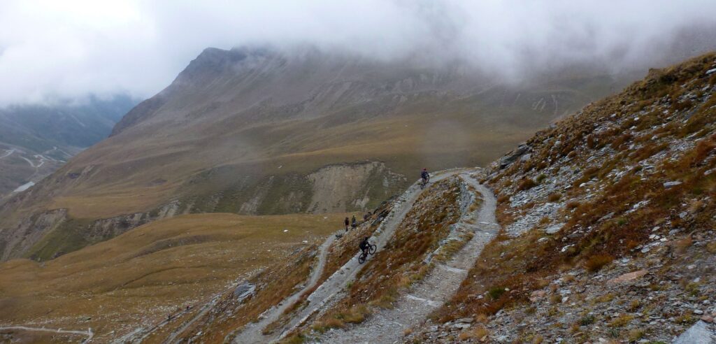 Zweimal überqueren wir die 2800 Meter-Marke. Das Wetter zeigt sich von der garstigen Seite. Wir sind im letzten langen Uphill bevor die unendliche Abfahrt startet. Nebel zieht auf und die Sicht beträgt schon bald keine 20 Meter mehr. Im glazial geprägten Gelände den Trail zu finden und die Gruppe beisammenzuhalten ist eine Herausforderung. Zwei Stunden knackige Trailabfahrt durch verschiedene Vegetationsstufen – ein Erlebnis das definitiv prägt.